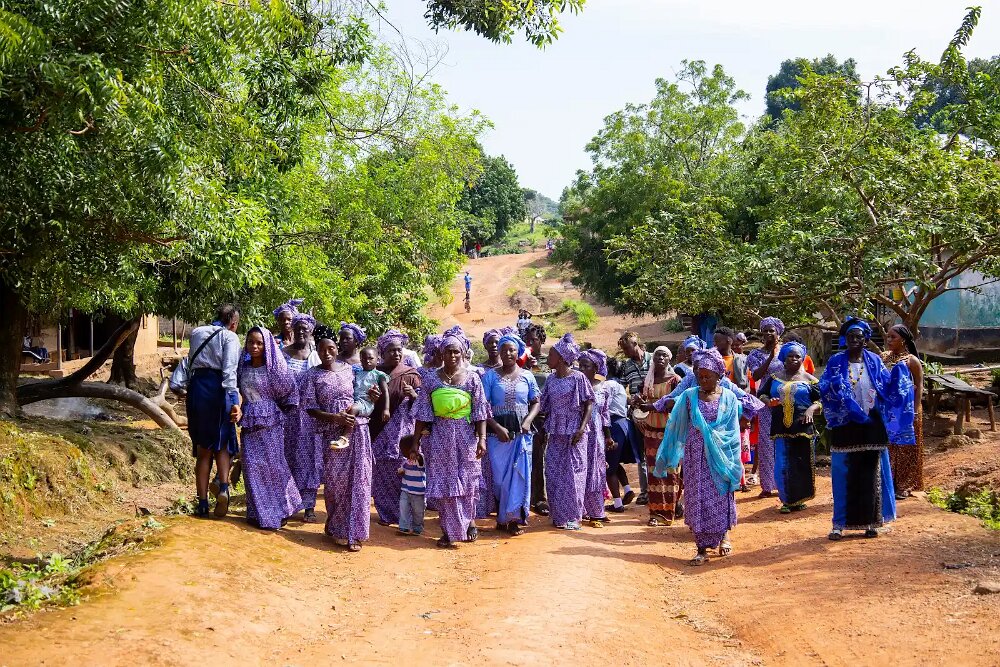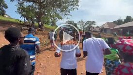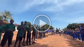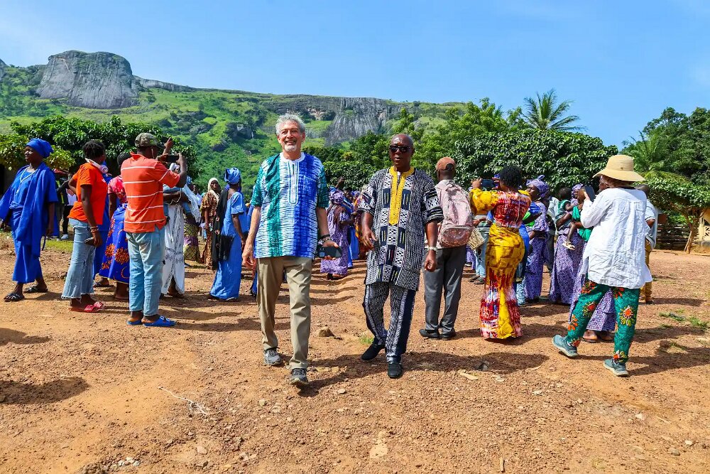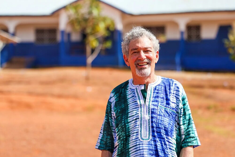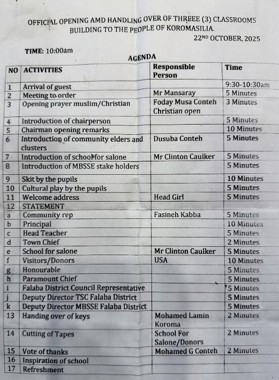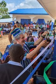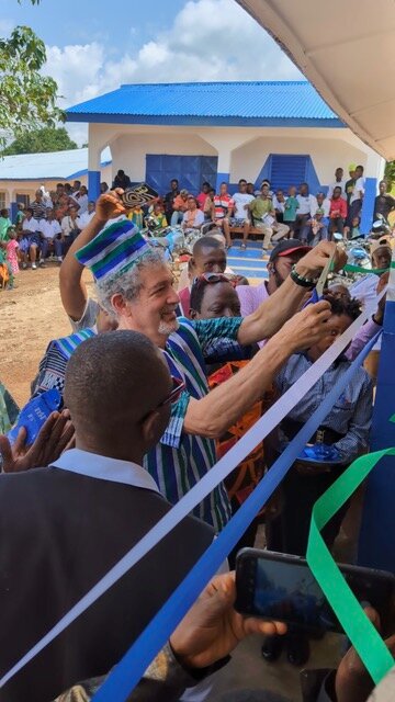 Ken Lans (donor) & Clinton Caulker (lead contractor, who heads SfS efforts in the North) at head of the singing and dancing procession to the school.